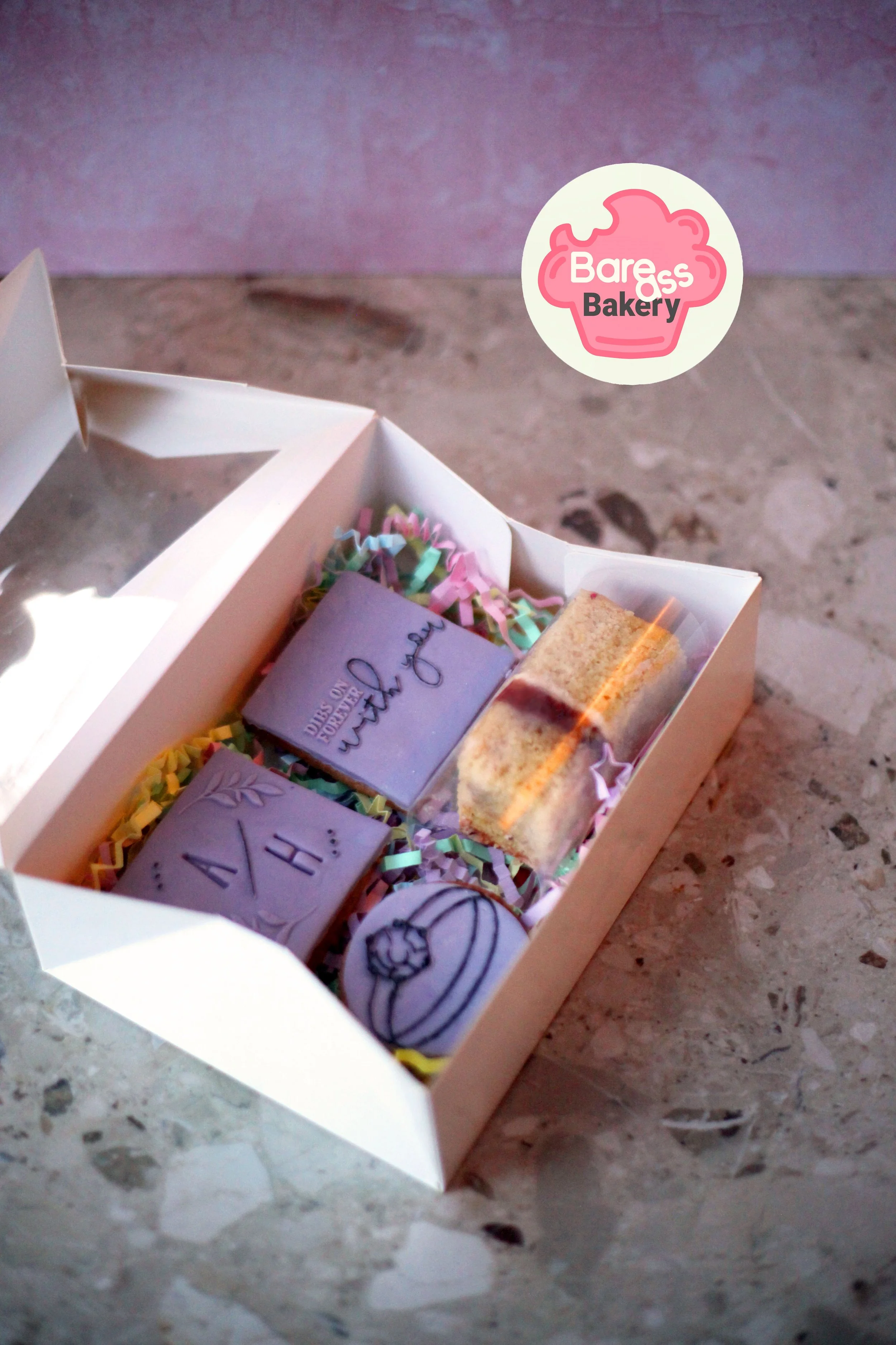 Secondly, we know how busy everyone’s lives are, so we’ve come up with an exciting solution to cater for everyone! A treat box version of a cake tasting experience straight to your door, no need to shower or brush your hair for this as you can enjoy in the comfort of your own home! You can initially pick from the same sponge flavour or up to 2 sponge flavours (if 2 are picked you’ll get to chose 3 different fillings and if you choose 1 sponge flavour then the filling will be mixed between classic and non conventional flavours. We also add 2 iced cookies personalised with your colour theme (the design and font style will differ from each couple as we like to make each one unique! Not only that, but an optional cakesicle with our signature Chocolate Storm Cake. This couple opted for a double dipped cakesicle (thicker coating) in comparison to our single dipped (Check out our Bespoke: Bridesmaid Treatbox as a reference)If you’d like to take us up on this & want specific flavor combinations that’s something we can certainly do. This service does come with a small price tag (not free) and if you decide to book with us that price will be deducted from the overall cake that you have chosen to purchase! Everything will be wrapped inside the treatbox, but for the purpose of the image we’ve shown them unwrapped.